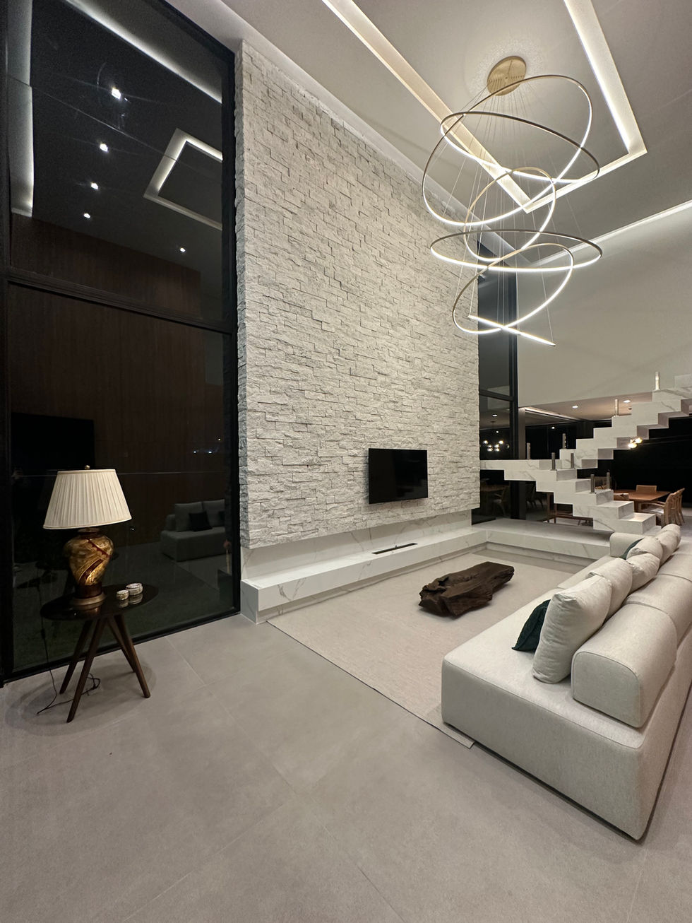Sophisticated modern residence built by Execute Construction from structure to final details. The façade combines exposed concrete, natural wood, and striking LED lighting design that enhances the bold geometry of the architecture. Large glass panels and open spaces connect indoors and outdoors seamlessly, while the clean lines and premium finishes highlight the elegance and innovation behind this project.