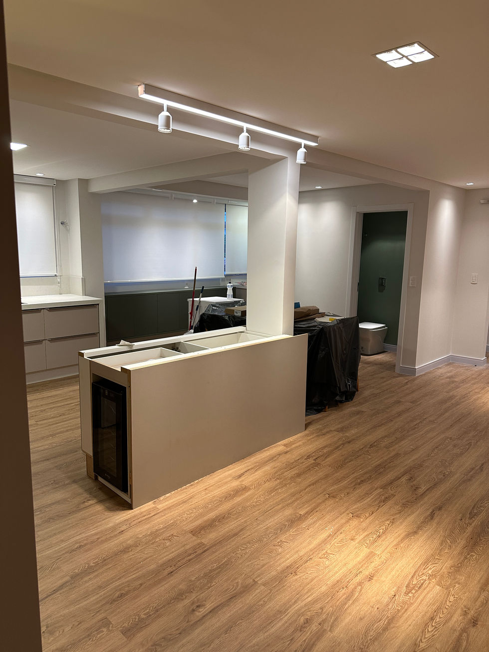 This remodel creates a warm and contemporary atmosphere through thoughtful design choices. Right at the entrance, the green accent wall adds personality and freshness, making the first impression both inviting and unique. In the living room, the wood paneling on the TV wall brings warmth and texture, complemented by integrated lighting that enhances the cozy feel of the space.